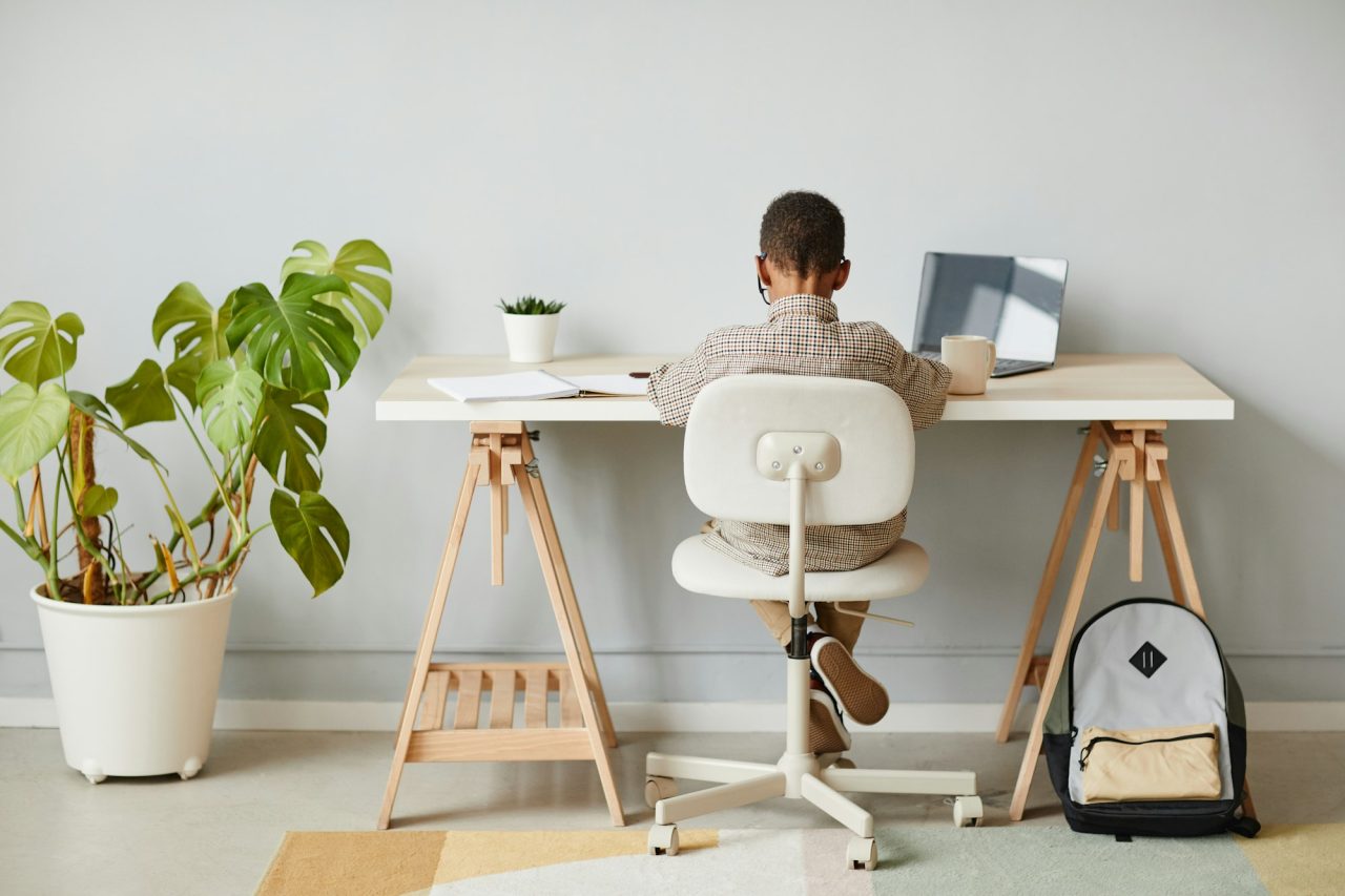 Freelancer working on a laptop in a cafe with a focused and creative workspace vibe